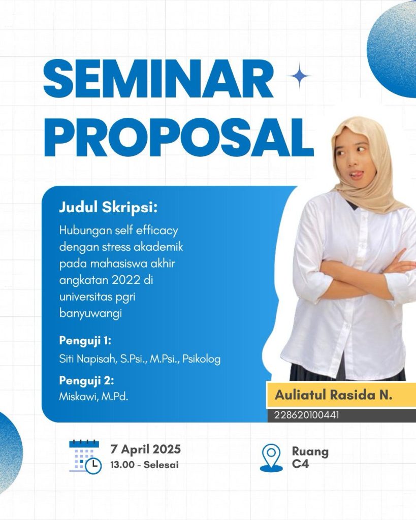 Telah dilaksanakan Seminar Proposal Skripsi pada tanggal 07 April 2026, atas nama Auliatul Rasida NIM 228620100441 dengan judul Proposal “Hubungan Self Efficacy dengan stress akademik pada mahasiswa akhir angkatan 2022 di Universitas PGRI Banyuwangi”. Peneliti telah berhasil memaparkan rancangan proposal penelitian dihadapan tim penguji yaitu dosen penguji 1. Siti Napisah, S.Psi., M.Psi., Psikolog dan dosen penguji 2. Miskawi, M.Pd. Fokus Presentasi meliputi latar belakang, rumusan masalah, dan metode penelitian. Berdasarkan masukan penguji, penelitian ini layak dilanjutkan dengan beberapa perbaikan.