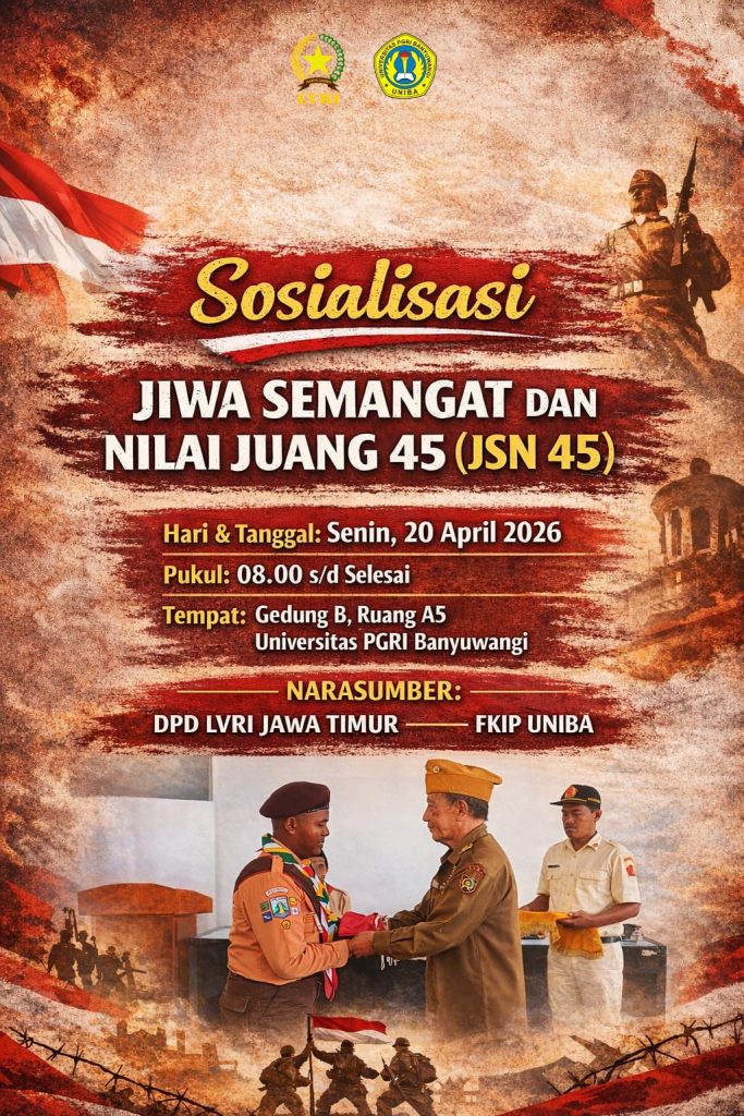 Banyuwangi, 20 April 2026 peserta BK sampai 20 mahasiswa yang mengikuti “Sosialisasi Jiwa Semangat dan Nilai Juang 45 (JSN)” dan kerjasama dengan veteran Rahma yang telah diselenggarakan di Kesbangpol (Badan Kesatuan Bangsa dan Politik) pukul 08.00 s/d selesai. Narasumber dalam sosialisasi ini yaitu DPD LVRI Jawa Timur – FKIP UNIBA.